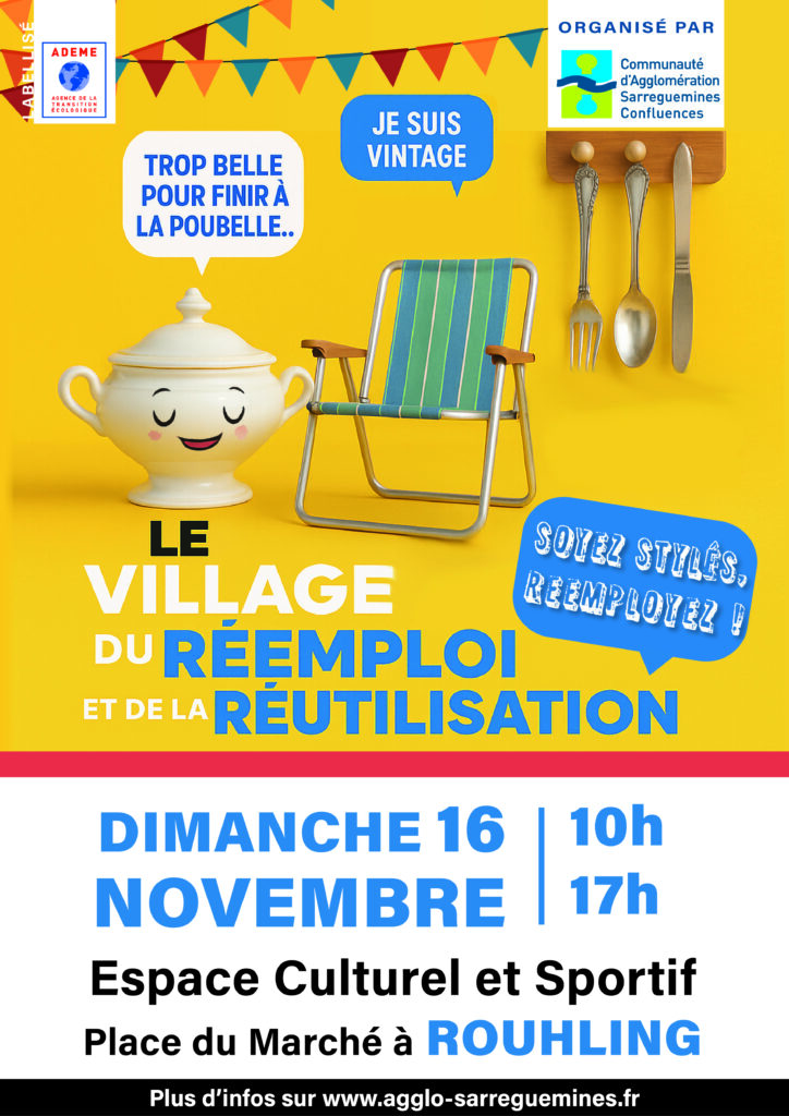 Le 16 novembre prochain, l’Agglo organise son  » Village du réemploi et de la réutilisation ». Cet événement se déroulera à l’Espace Culturel et Sportif, Place du Marché à Rouhling.